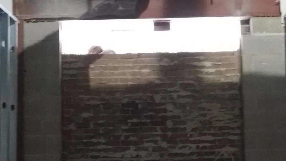 Sorry been no time for posting but heres a few pics. Was interesting to see how they put openings thru the block. They do a saw cut bang out the cement blocks and leave the brick outer shell, Then the next day they saw cut around the opening and knocked the brick out, Stopped by at 9 last night and got rewarded by seeing the front lobby door and windows all cut out! Love these workaholics we hired! Was thinking of cleaning up the brick to use inside for the fireplace but no time to clean it up. Would have been nice to have MATCHING brick ya know LOL